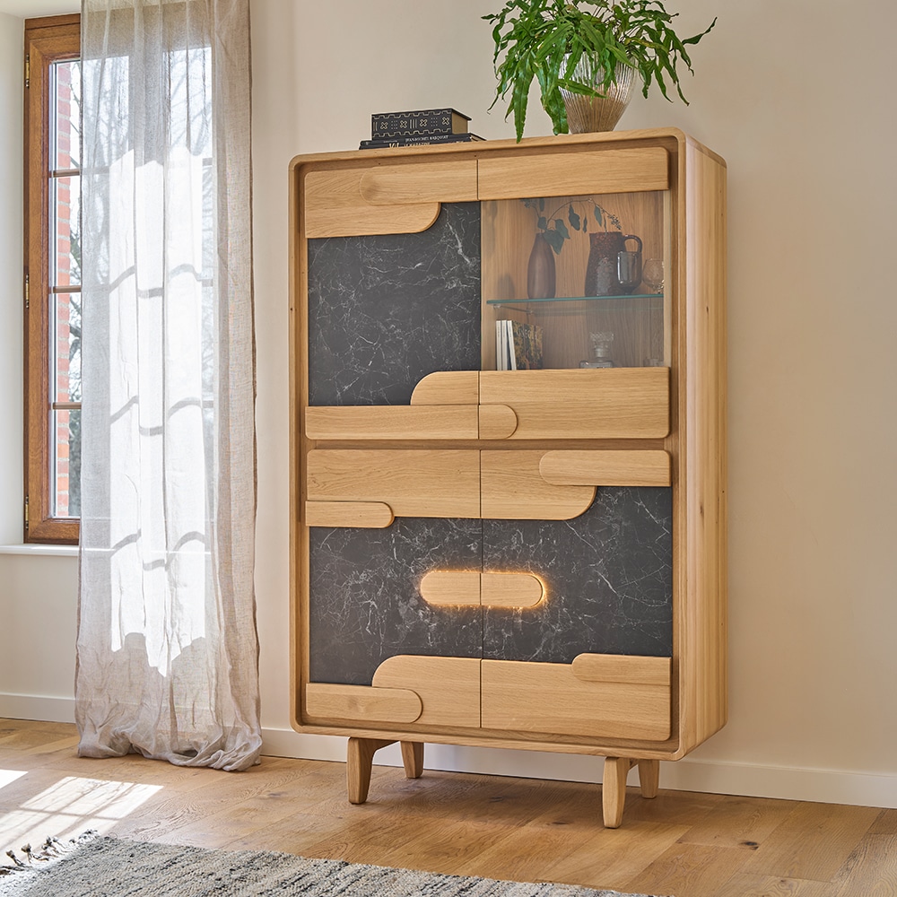 Son piétement en chêne massif et son relief signature affirment une présence forte, tandis que la porte vitrée apporte une respiration visuelle et valorise vos pièces préférées. Vaisselle, livres, objets de voyage : chaque élément trouve sa place derrière les portes battantes ou sur l’étagère en verre. Les différentes finitions de bois et de céramique permettent de la personnaliser à votre goût, et l’éclairage LED en option révèle ses volumes avec finesse. Harmonisant matière et transparence, la vitrine ABSOLU devient un véritable point focal dans la pièce.