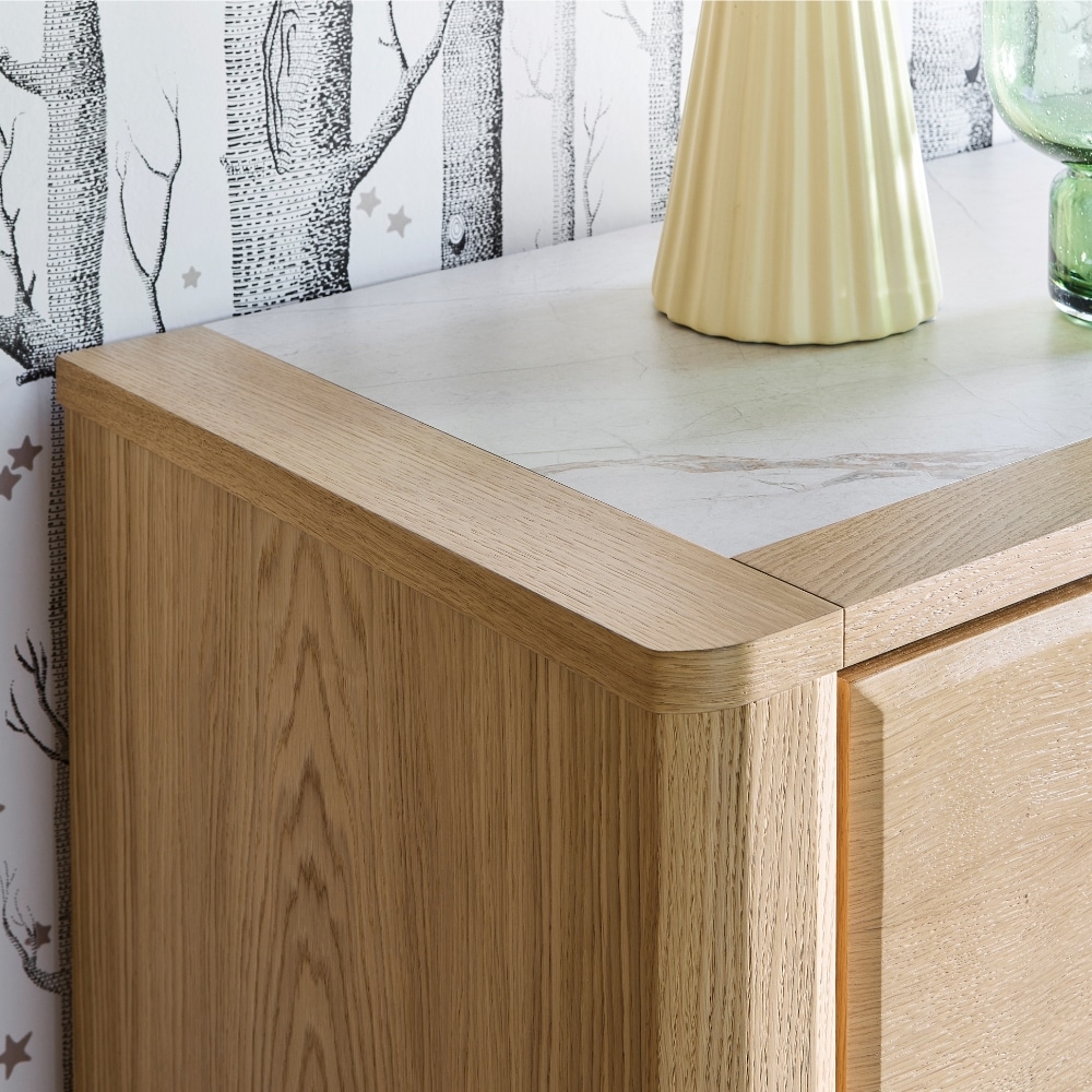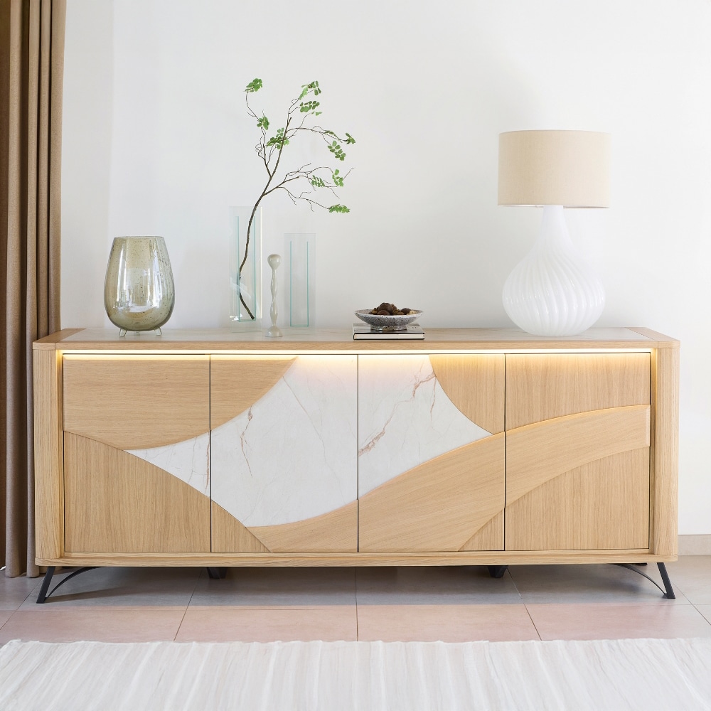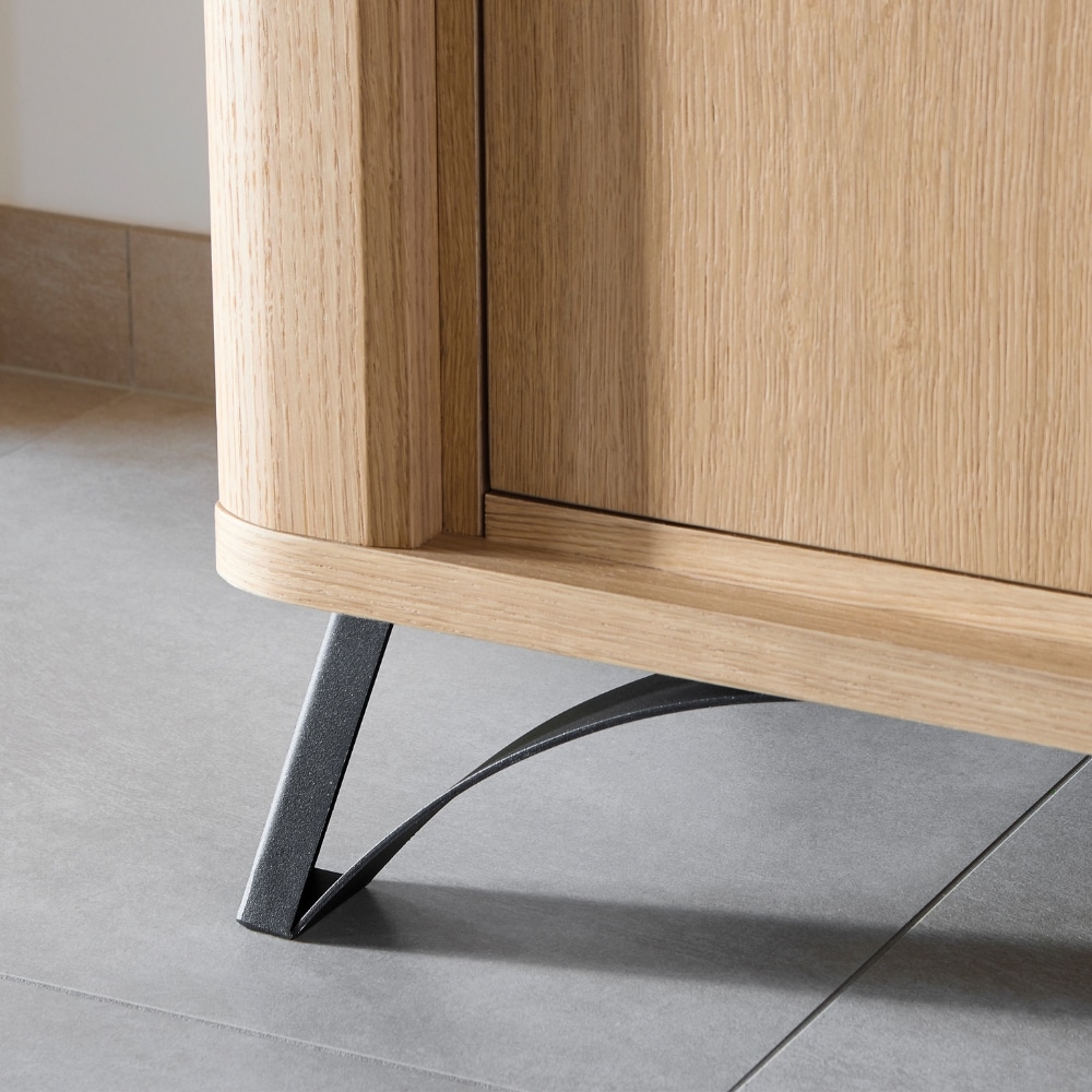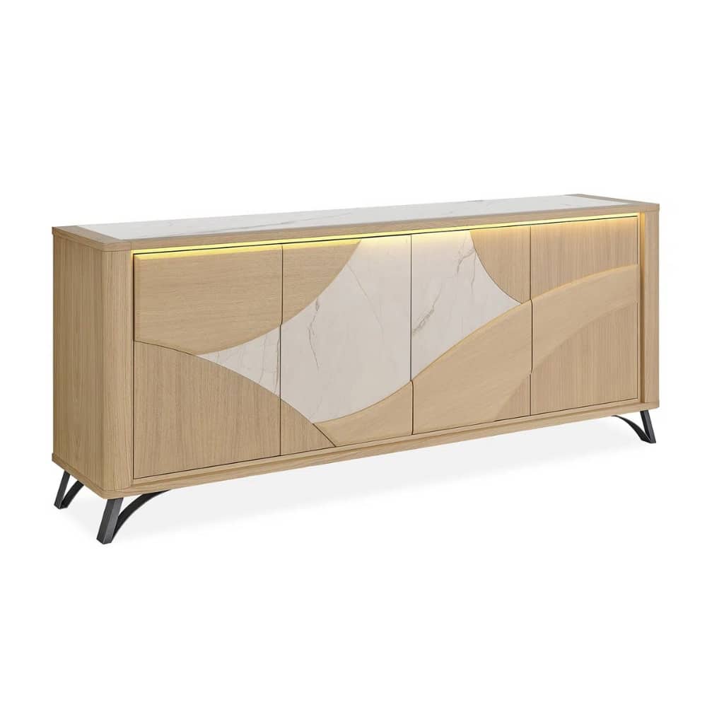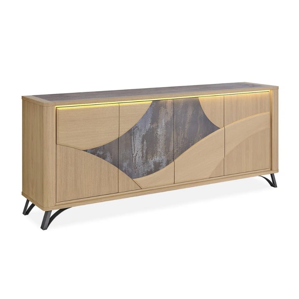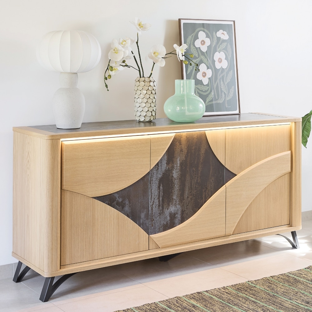 L’enfilade 4 portes RIVIERA équilibre esthétique contemporaine et praticité. Ses façades ondoyantes donnent du relief à votre intérieur, tandis que ses pieds en fer noir ajoutent une note design bien affirmée. Spacieuse, elle offre un rangement optimal et une surface parfaite pour vos décorations. Elle existe aussi en buffet 3 portes, idéal pour les pièces plus petites.