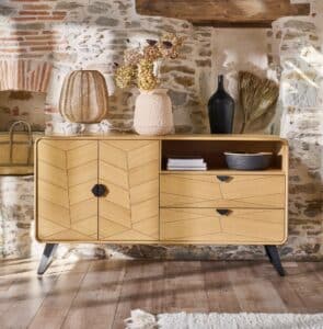 Avec ses pieds en épingle et sa porte coulissante en métal avec roulettes, l’enfilade Sunset apportera à votre séjour un esprit industriel très tendance. Associez-la avec la table, la vitrine ou encore la bibliothèque de la même collection pour un intérieur harmonieux.