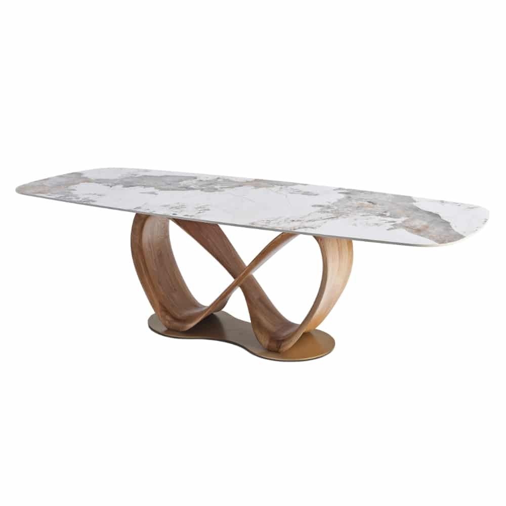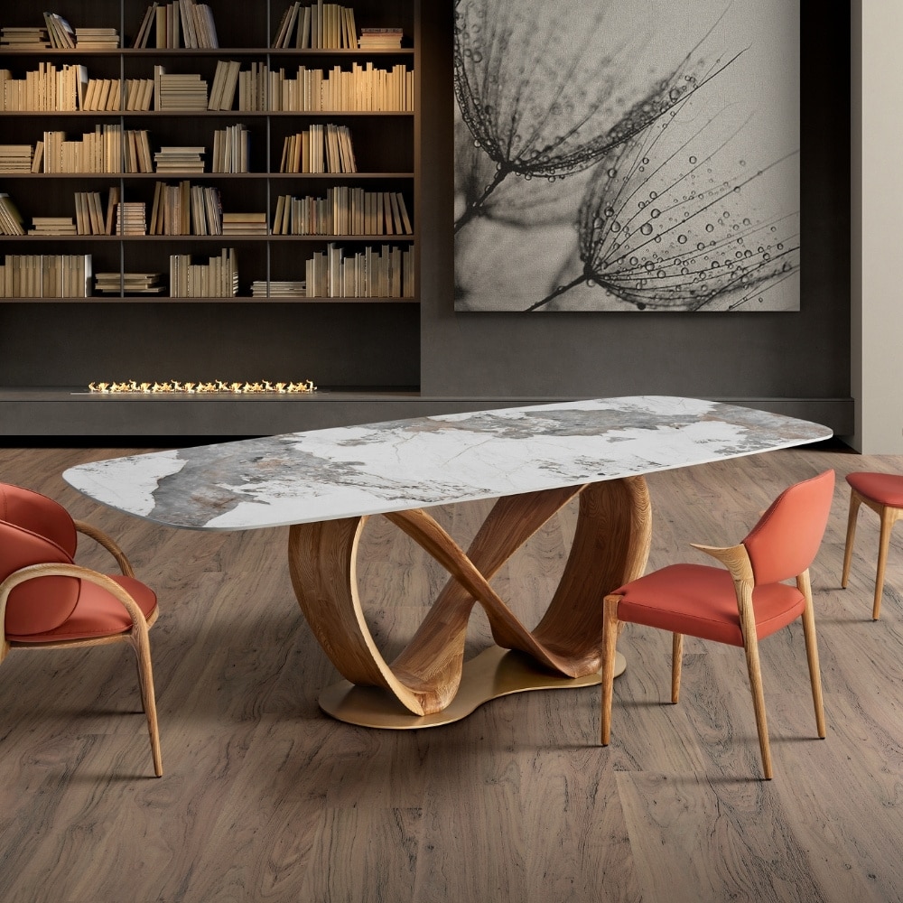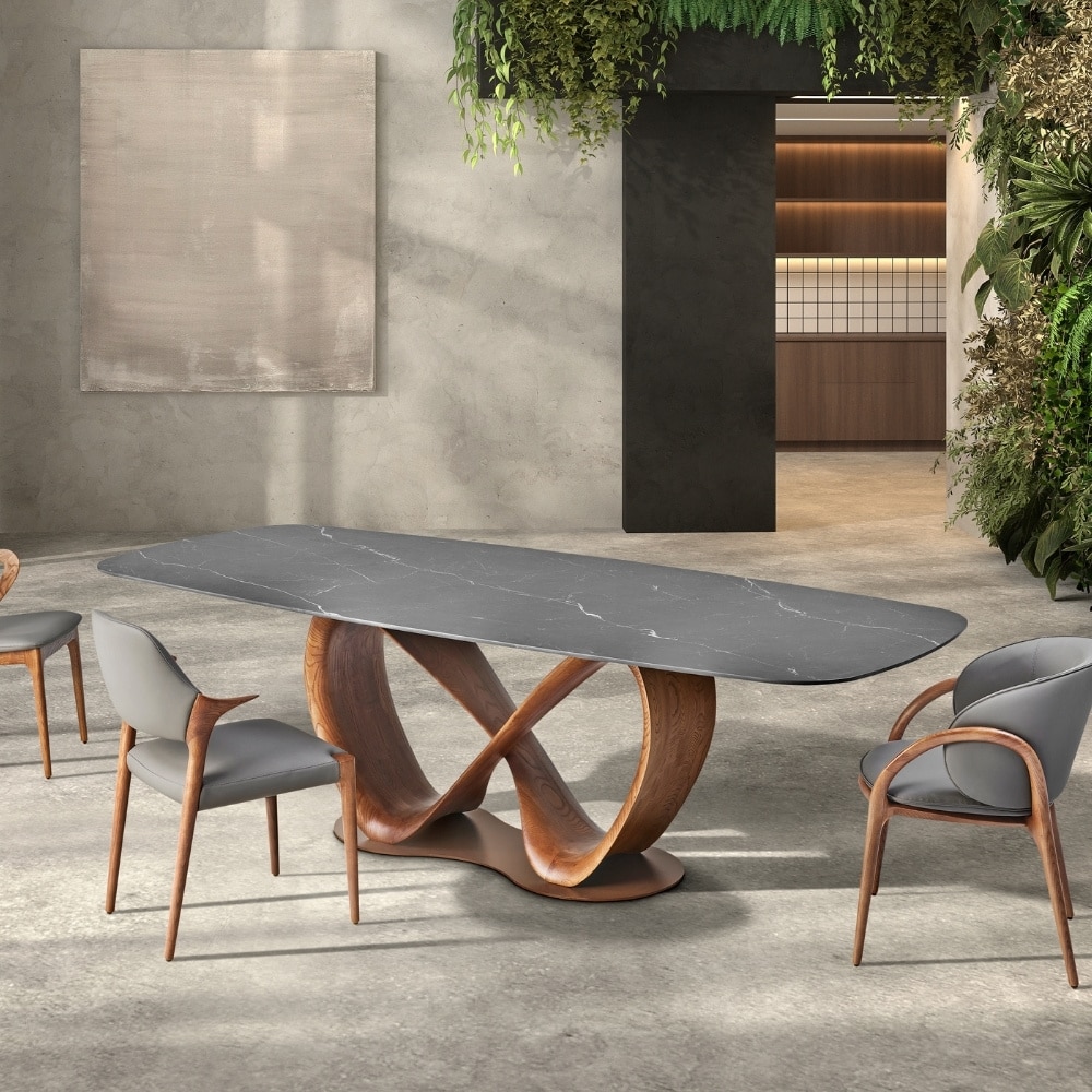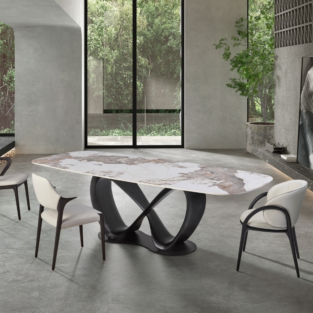 La table de repas LYRA charme par l’élégance de son plateau en céramique proposé en deux finitions raffinées, et la silhouette sculpturale de son piètement en bois massif, décliné en trois teintes : nature, brun ou noir. Avec ses lignes ovales et ses 260 cm de longueur, elle peut accueillir jusqu’à 10 convives, dans une ambiance chaleureuse et sophistiquée. Également disponible en version 220 cm, la table LYRA affirme sa présence avec subtilité, entre authenticité des matières et exigence du design.