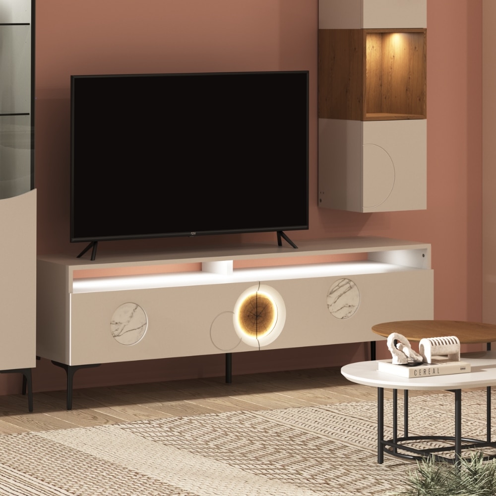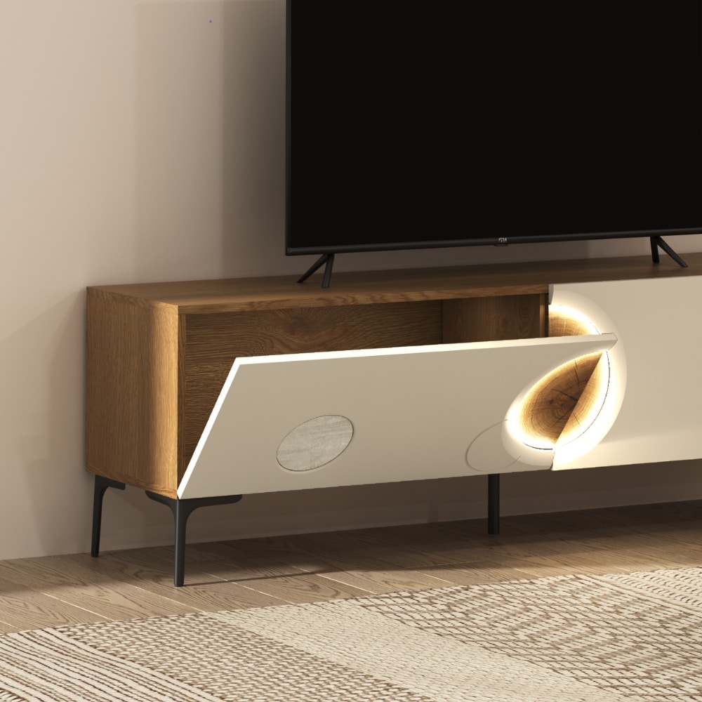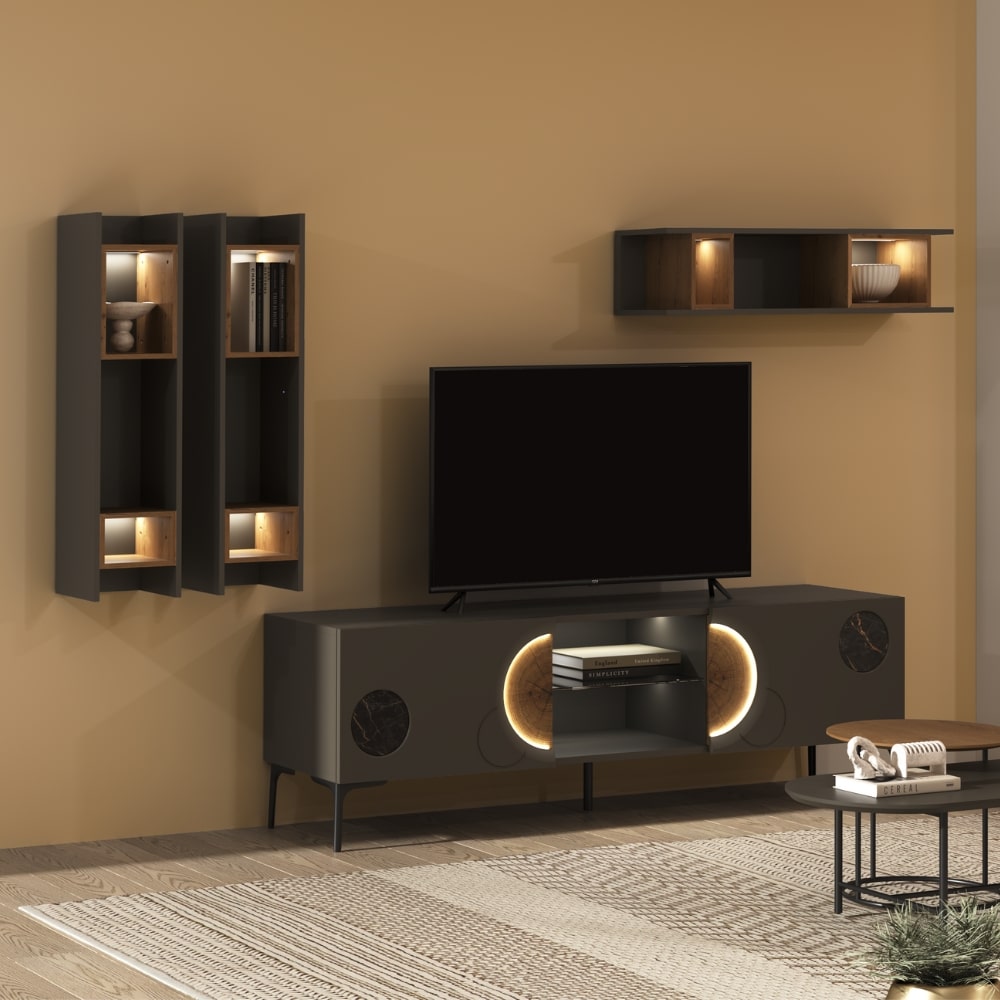 Personnalisez votre espace TV en choisissant parmi les différentes configurations et modules muraux assortis, pour créer un ensemble cohérent et équilibré. La force de ce modèle réside dans son élégante discrétion : il cache avec soin vos équipements (box, câbles, accessoires) derrière ses façades laquées, rythmées par le caractère brut du bois debout et de la céramique. L’éclairage LED optionnel en façade révèle la profondeur des textures et transforme le meuble TV en un véritable point d’attention, contribuant à l’atmosphère sereine de votre salon.