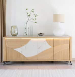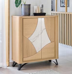 La collection RIVIERA, c’est la rencontre de matières qui se répondent comme deux courants en mouvement : le bois dessine la courbe, la céramique prolonge son geste. Deux finitions s’offrent à vous : le Brun panaché, intense et captivant, ou le Beige veiné, doux comme une lumière apaisée.