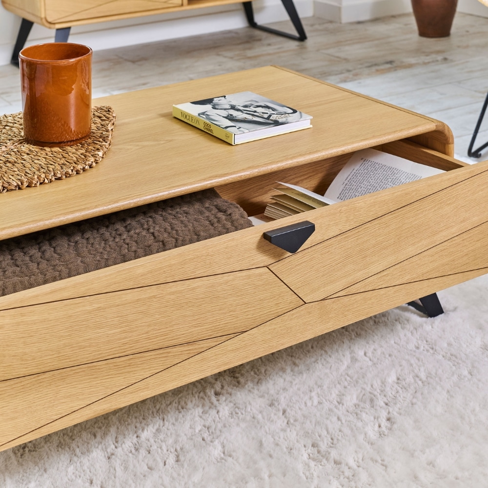 Son tiroir, orné du décor signature de la collection, permet de garder le plateau toujours épuré, prêt à accueillir livres, tasses ou objets favoris du moment. Les angles arrondis en chêne massif adoucissent sa silhouette, tandis que la face arrière, identique à la façade, offre une liberté de placement totale. Le piétement trapèze en métal noir mat apporte légèreté et équilibre graphique à l’ensemble, faisant de cette table basse une pièce à la fois fonctionnelle et esthétique.