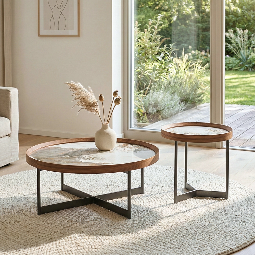 La table basse CRILLON joue sur le contraste entre la douceur lumineuse de sa céramique brillante et la profondeur chaleureuse du noyer. Son piétement en métal finition bronze ancre l’ensemble avec présence. La table basse de 90 cm et le guéridon assorti de 50 cm créent un jeu de proportions équilibré, qui structure l’espace avec clarté et élégance.