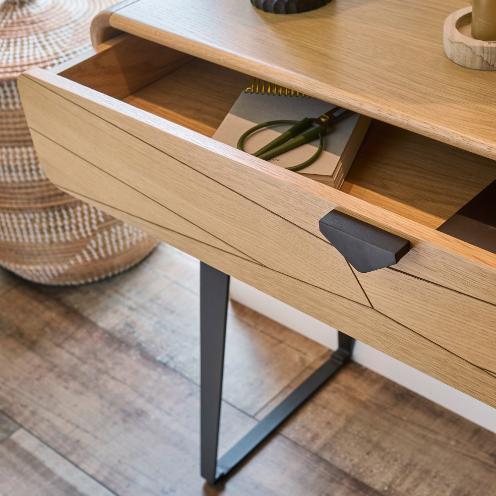 La console TOKYO séduit par ses proportions compactes et sa fonctionnalité. On y dépose ses clés, on y met en scène un objet décoratif ou un bouquet de fleurs, tout en profitant d’un rangement discret dans son tiroir central habillé du motif chevron. Les hauts pieds trapèze en métal noir mat soulignent sa silhouette élancée et apportent un équilibre graphique à l’ensemble. Petite mais affirmée, cette console structure subtilement un couloir ou un coin salon. Prêt à compléter votre séjour avec style ? Plongez dans l’univers complet de la collection TOKYO.